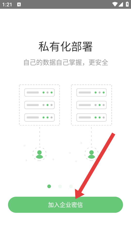 2、進入私有化部署的介紹頁,可以往右滑動進行查看,點擊綠色的加入企業(yè)密信按鈕,進入app的服務(wù)器加入流程。
