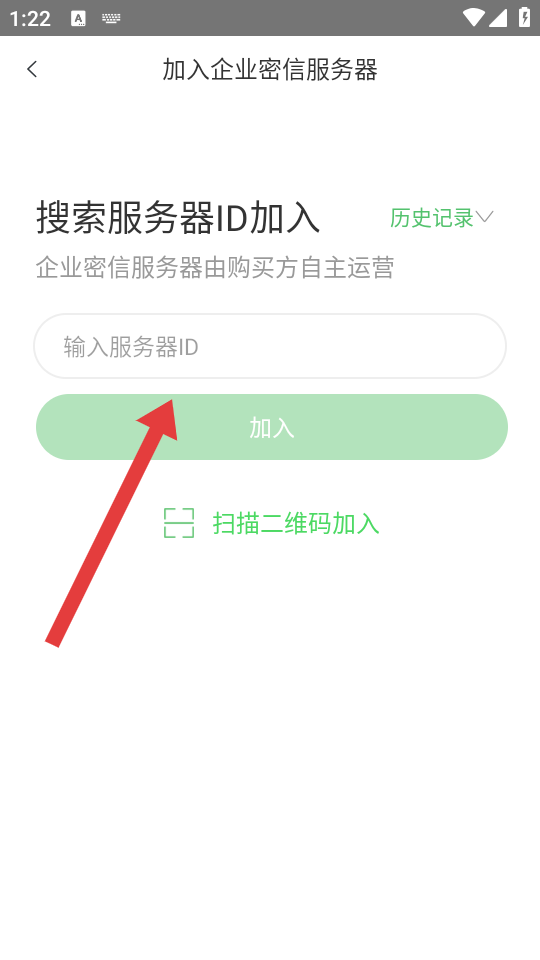 3、在加入企業(yè)密信服務器頁面,于輸入服務器ID框填寫服務器ID,點擊加入,也可選擇掃描二維碼加入方式完成操作。