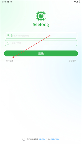 1、啟動(dòng)seetongAPP,進(jìn)入時(shí)點(diǎn)擊左側(cè)用戶注冊(cè)的按鈕。