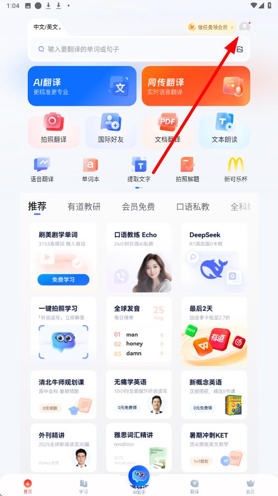 1、打開網(wǎng)易有道詞典應(yīng)用,點(diǎn)擊首頁右上角頭像個(gè)人中心圖標(biāo),進(jìn)入個(gè)人相關(guān)界面。