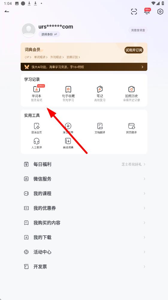 2、在個(gè)人界面中的學(xué)習(xí)記錄板塊里點(diǎn)擊單詞本選項(xiàng),進(jìn)入單詞本相關(guān)操作頁面。
