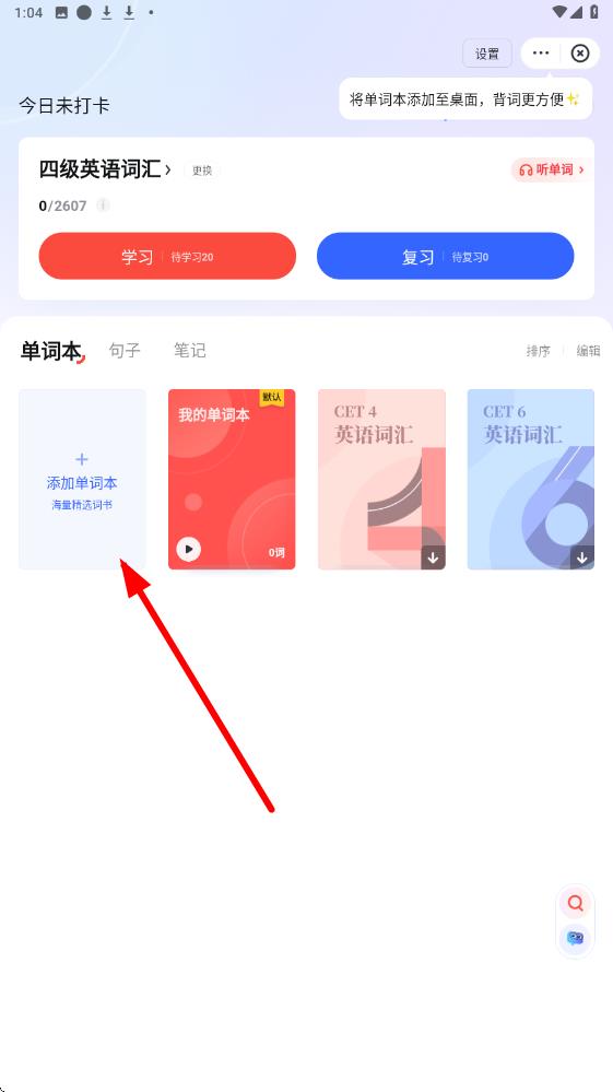 3、在單詞本頁面中找到添加單詞本選項(xiàng),點(diǎn)擊該選項(xiàng)然后按照提示操作即可導(dǎo)入你所需的單詞本。