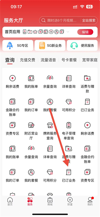 2、在服務(wù)大廳的查詢板塊中,點擊已訂業(yè)務(wù)選項。
