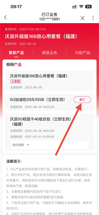 3、進入已訂業(yè)務(wù)頁面后,找到要退訂的套餐,點擊退訂按鈕。
