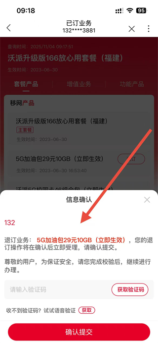 4、在信息確認頁面,獲取并輸入驗證碼后點擊確認提交即可完成套餐退訂操作。