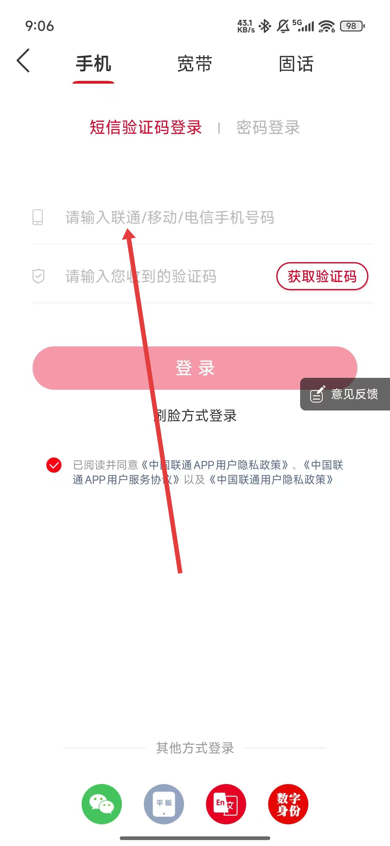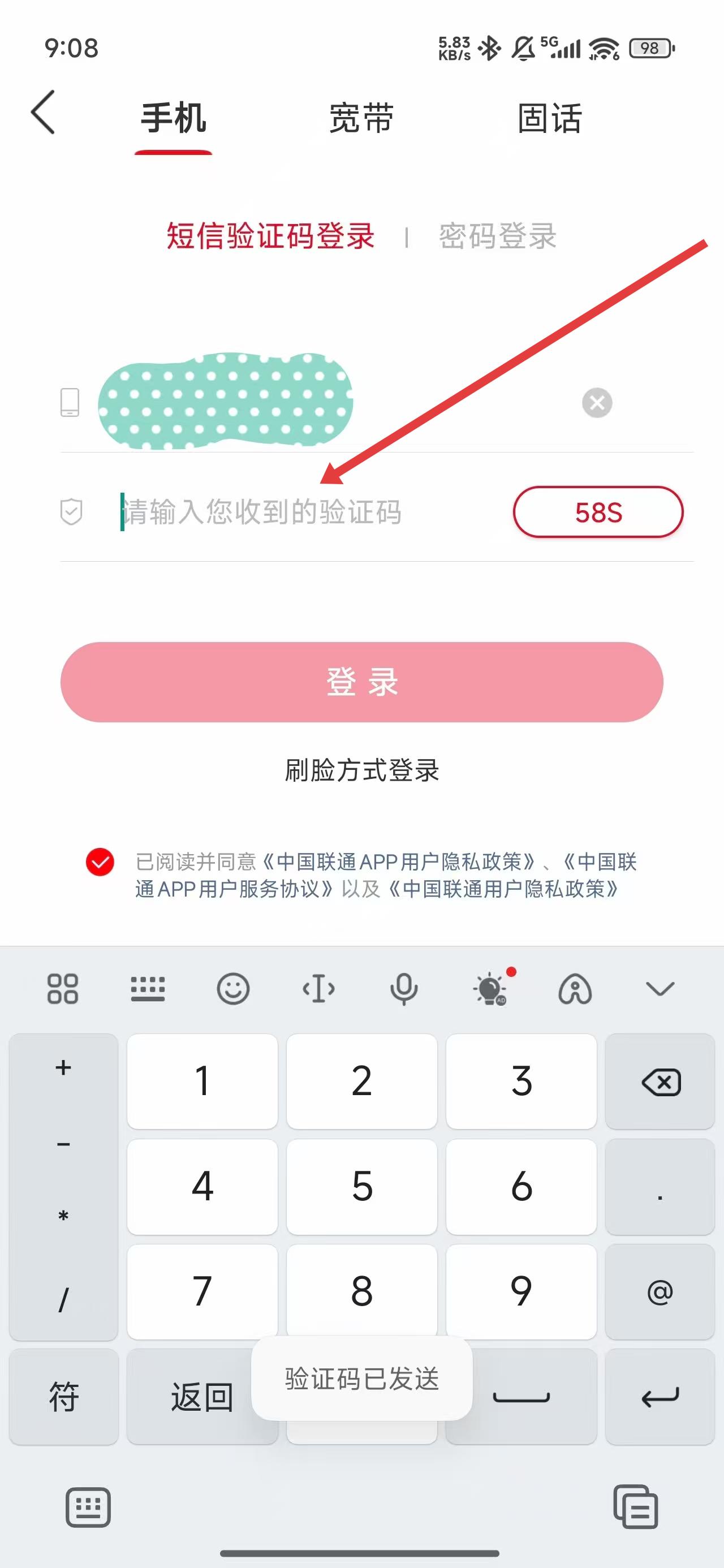 4、在點(diǎn)擊獲取驗證碼后,點(diǎn)擊輸入框輸入驗證碼完成登錄操作。