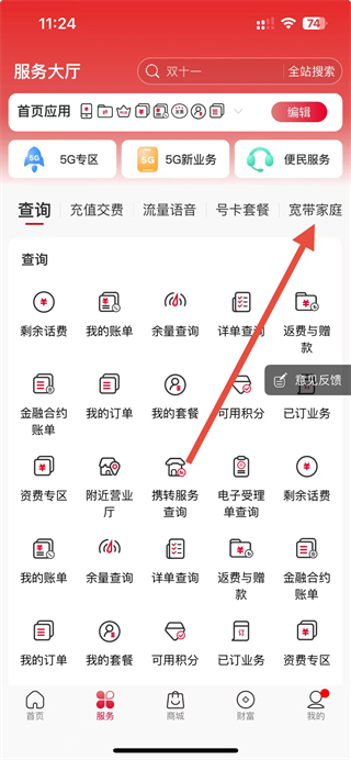 2、在服務(wù)大廳頁面,點(diǎn)擊寬帶家庭選項,進(jìn)入寬帶家庭服務(wù)頁面。