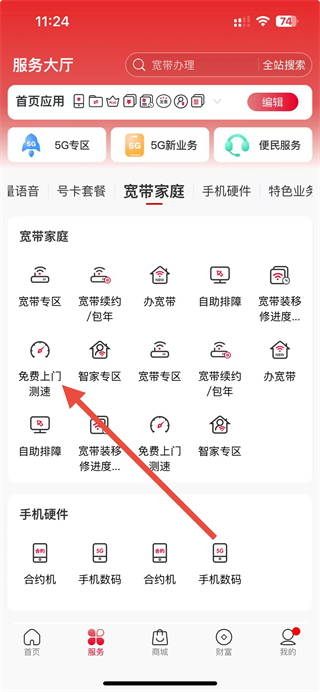 3、在寬帶家庭服務(wù)頁面,點(diǎn)擊免費(fèi)上門測速選項,進(jìn)入預(yù)約網(wǎng)絡(luò)檢測單頁面。