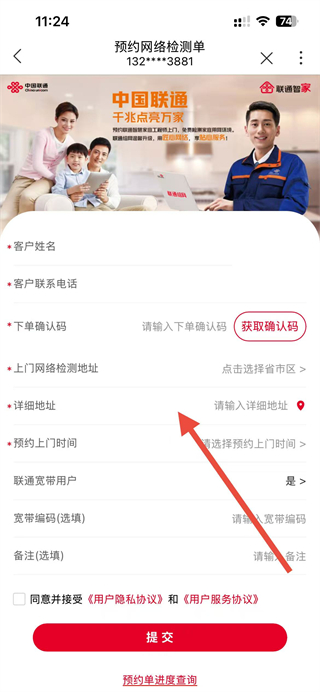 4、在預(yù)約網(wǎng)絡(luò)檢測單頁面填寫個人信息,勾選同意協(xié)議后點(diǎn)擊提交,即可完成免費(fèi)上門測速服務(wù)預(yù)約。