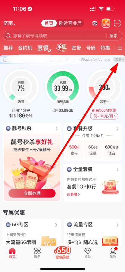 2、在首頁找到并點(diǎn)擊套餐選項,一般在“推薦”業(yè)務(wù)分類附近,進(jìn)入套餐辦理相關(guān)頁面。