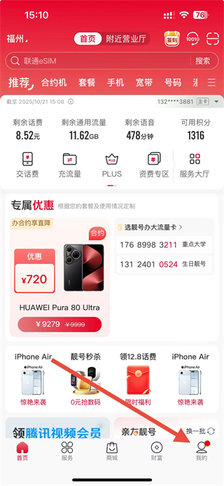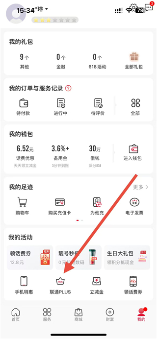 2、在個人頁面,找到聯(lián)通PLUS選項并點(diǎn)擊,進(jìn)入聯(lián)通PLUS會員頁面。