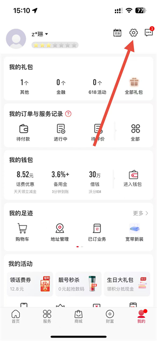 2、進(jìn)入我的頁面后,點(diǎn)擊右上角齒輪形狀的設(shè)置圖標(biāo)。