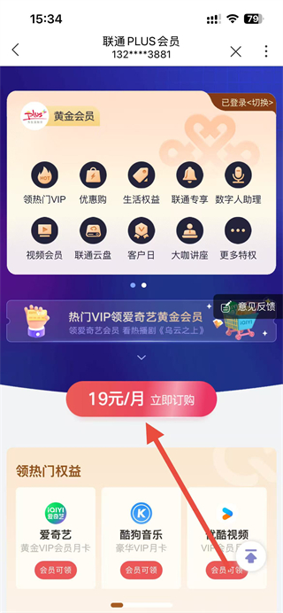 3、在聯(lián)通PLUS會員頁面,點(diǎn)擊立即訂購按鈕,按提示完成會員業(yè)務(wù)開通操作。