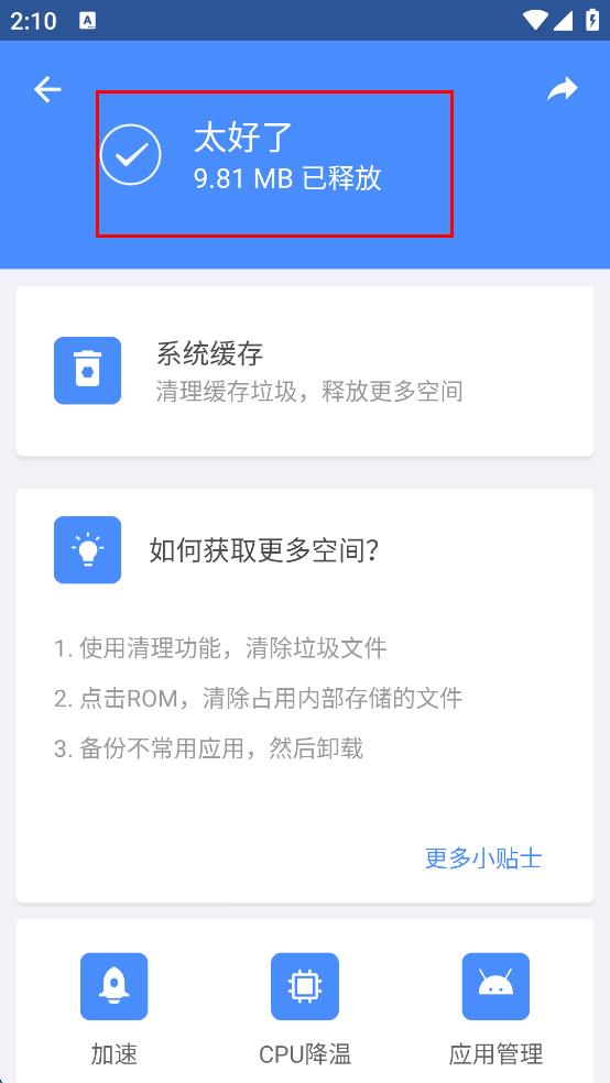 4、清理完成后,頁(yè)面會(huì)提示釋放的空間大小,如“9.81MB已釋放”,同時(shí)還會(huì)給出一些獲取更多空間的建議,如使用清理功能、清除占用內(nèi)部存儲(chǔ)的文件、備份卸載不常用應(yīng)用等。