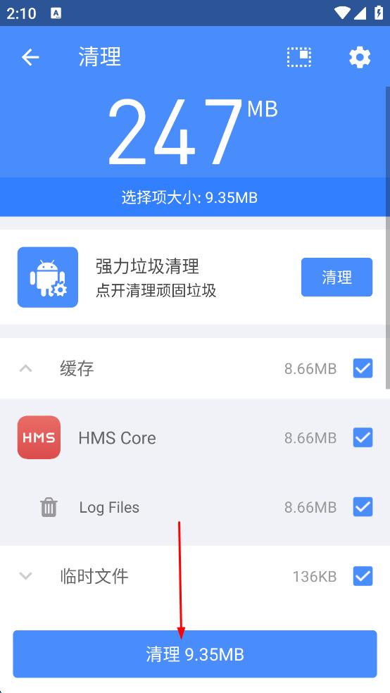 2、進(jìn)入清理頁(yè)面,看到可清理的垃圾類型及大小,比如緩存、HMS Core、Log Files、臨時(shí)文件等,確認(rèn)要清理的內(nèi)容。