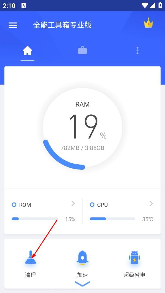 1、打開(kāi)全能工具箱專業(yè)版app,進(jìn)入主界面后,看到有“RAM”“ROM”“CPU”等顯示區(qū)域,以及“清理”“加速”“超級(jí)省電”等功能選項(xiàng),點(diǎn)擊“清理”選項(xiàng)。