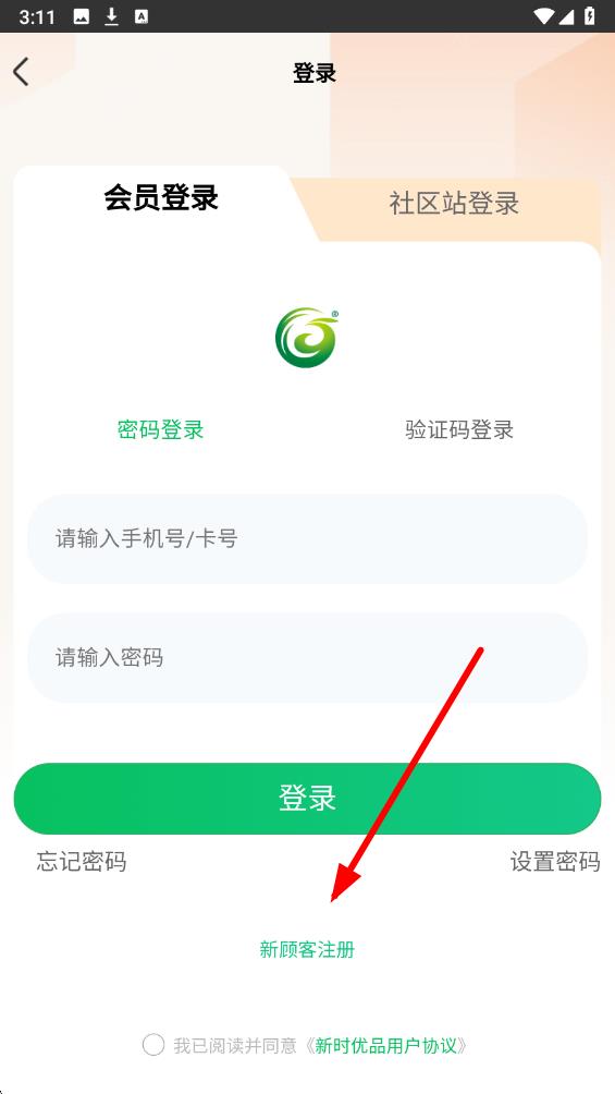 2、在登錄界面下方,點擊新顧客注冊選項,進入新顧客注冊頁面。