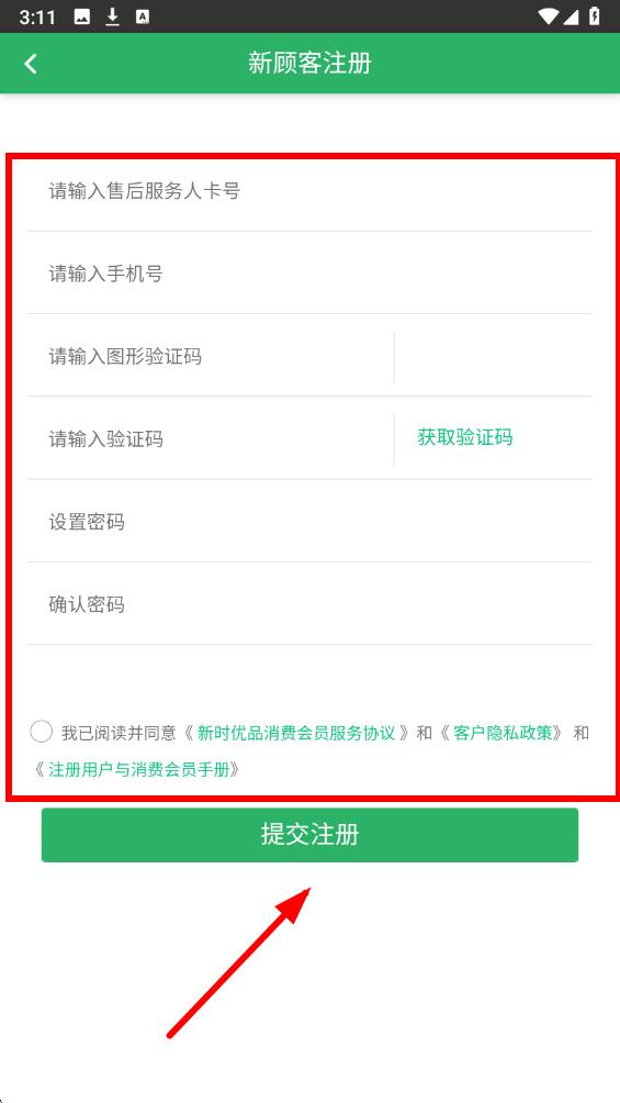 3、在新顧客注冊頁面,依次填寫售后服務人卡號、手機號驗證碼、設置密碼,勾選同意相關協(xié)議后,點擊提交注冊按鈕,完成注冊操作。