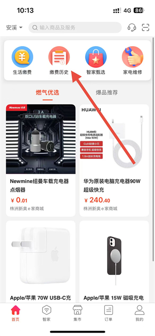 1、在e城e家app首頁點擊繳費歷史選項,進入生活繳費頁面。