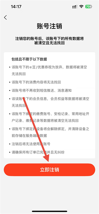 4、在賬號注銷界面,仔細閱讀說明后點擊立即注銷,即可完成e城e家賬號注銷。