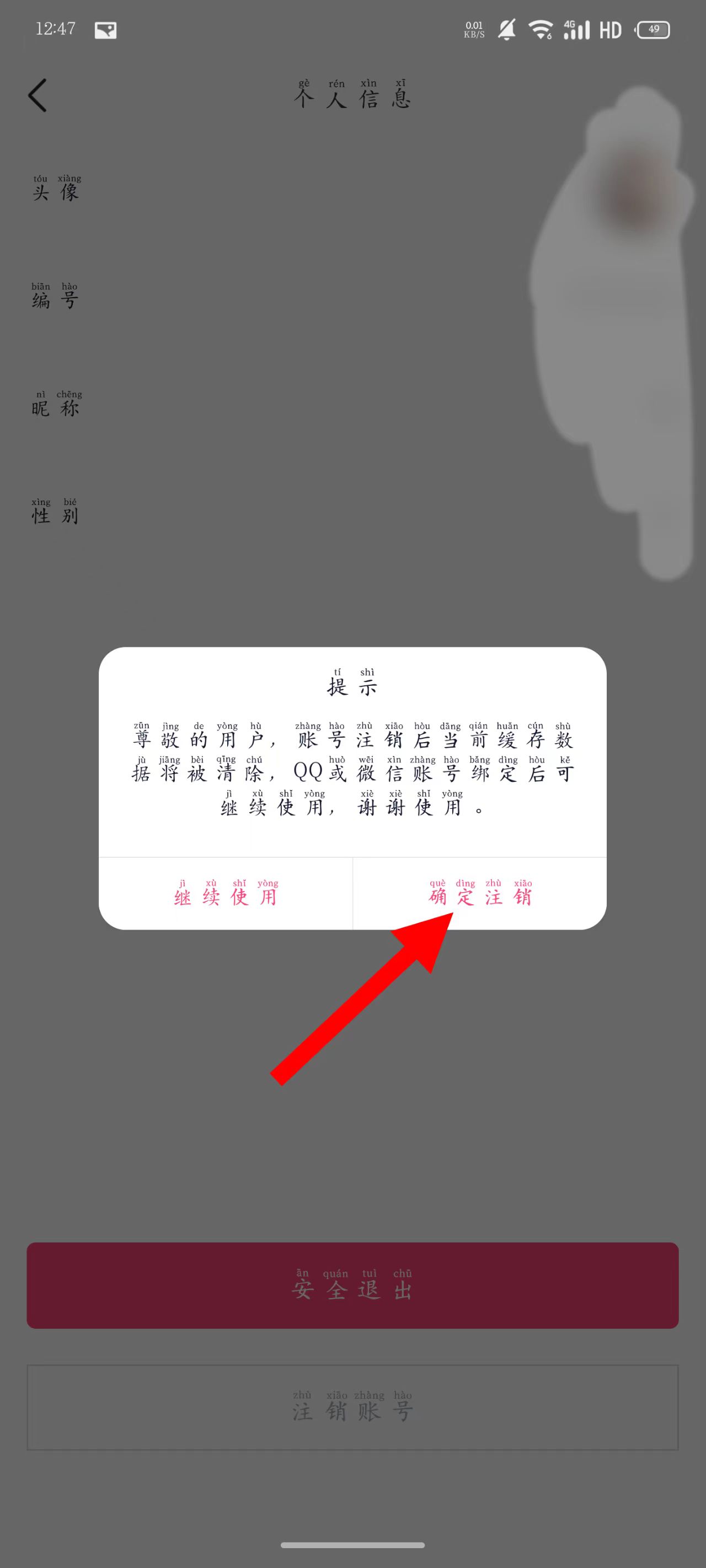 4、點擊后會彈出提示窗口,仔細(xì)閱讀提示內(nèi)容后,點擊確定注銷即可完成賬號注銷操作。