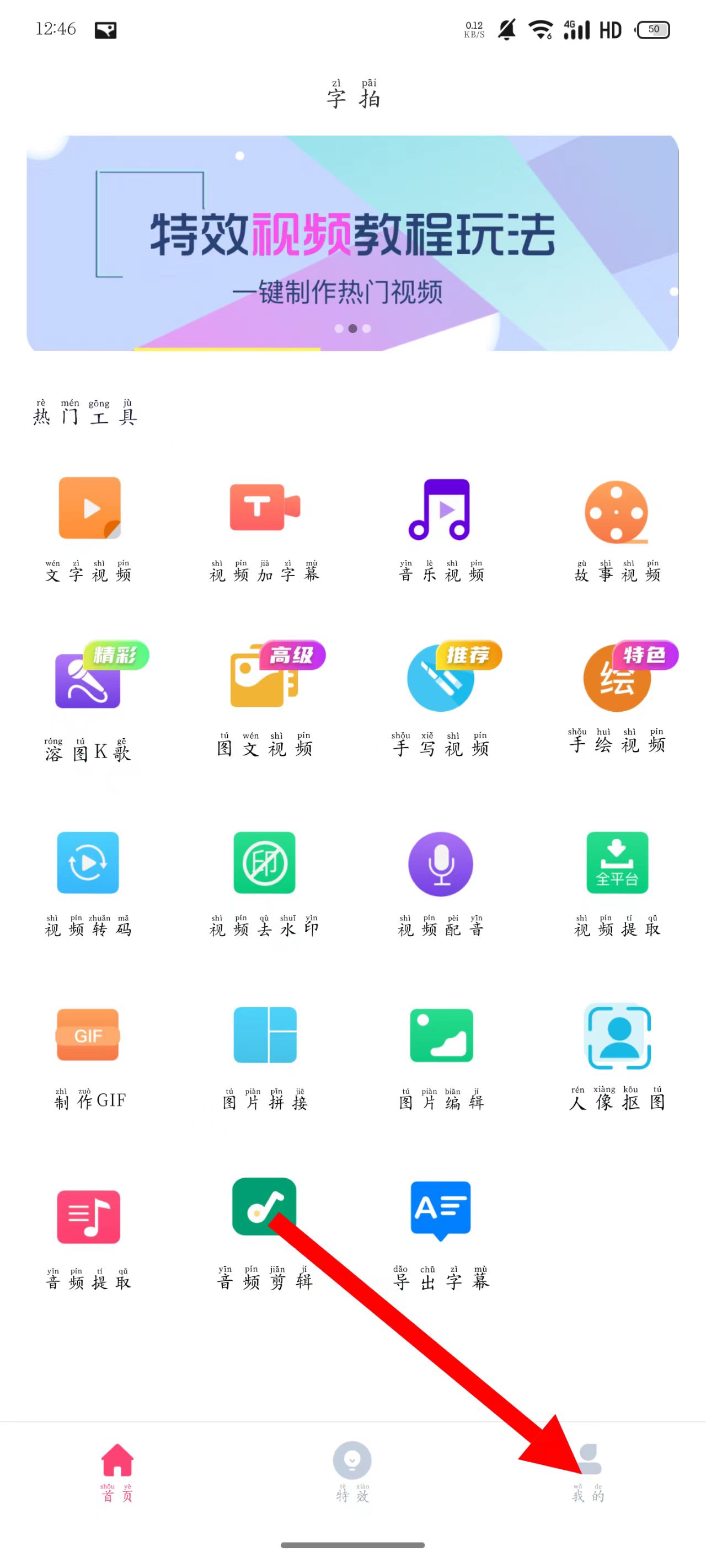 1、打開字拍app,點擊底部導(dǎo)航欄中的我的進(jìn)入個人相關(guān)界面。