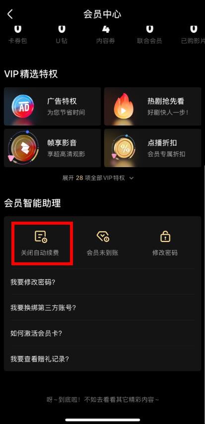 3、在會員中心頁面,下滑找到后點擊其中的關(guān)閉自動續(xù)費選項,按照提示操作即可完成取消。
