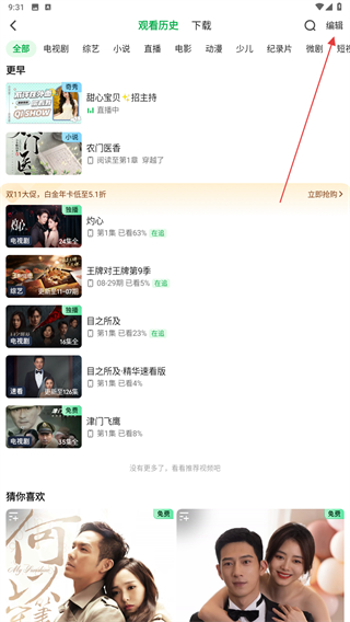 2、進(jìn)入觀看歷史的頁面內(nèi),點(diǎn)擊右上編輯的按鈕。