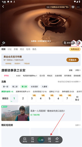 3、進(jìn)入播放的頁面內(nèi),點(diǎn)擊下方下載的功能按鈕。