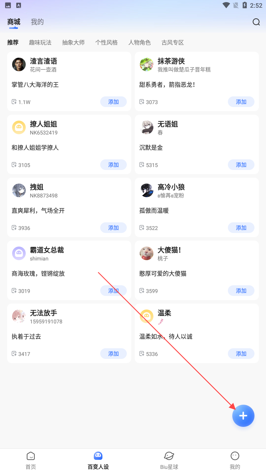 1、打開訊飛輸入法,點擊底部導(dǎo)航欄中的百變?nèi)嗽O(shè)進(jìn)入相關(guān)界面,瀏覽推薦的各類人設(shè)模板,若想創(chuàng)建自己的人設(shè),點擊右下角藍(lán)色+號按鈕。