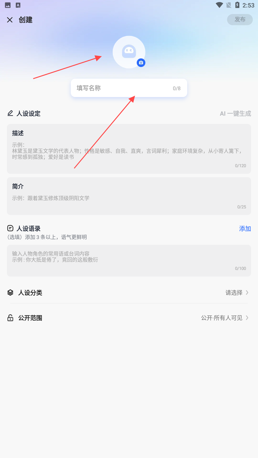 2、進(jìn)入創(chuàng)建界面后,先點擊頭像區(qū)域選擇或拍攝一張代表該人設(shè)的圖片,接著在填寫名稱處輸入人設(shè)的名字,然后在人設(shè)設(shè)定板塊,根據(jù)提示填寫人物描述等內(nèi)容,塑造人設(shè)形象。