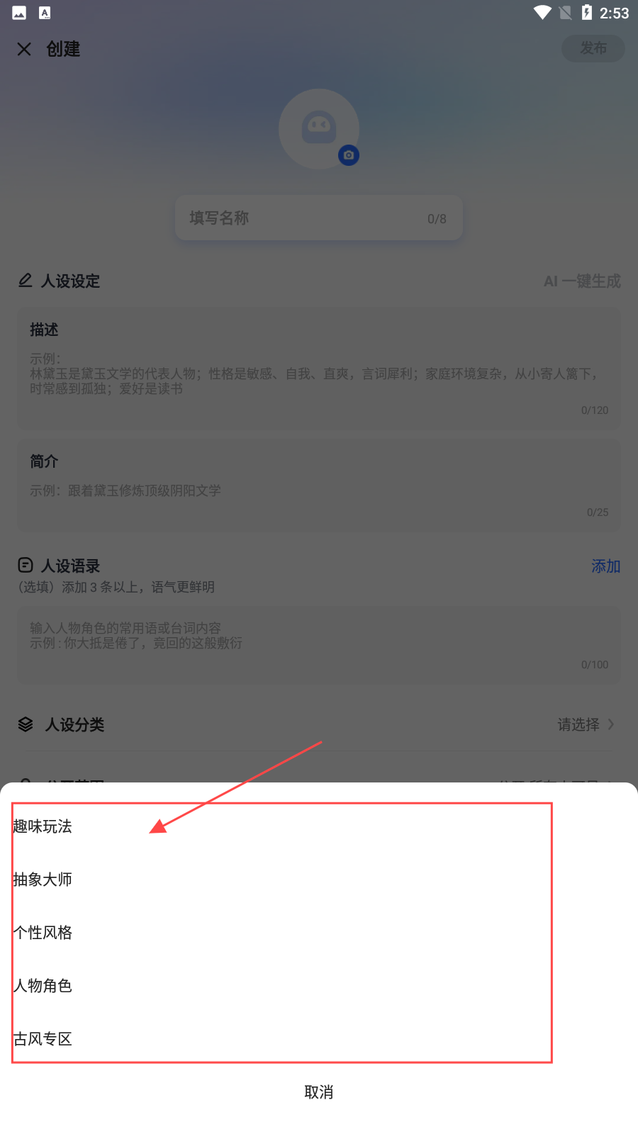3、在人設(shè)語錄板塊,可添加人物角色的常用語或臺詞,讓人設(shè)更加鮮活,之后點擊人設(shè)分類,從趣味玩法、抽象大師等分類中選擇適合的類別,最后設(shè)置公開范圍,點擊發(fā)布。