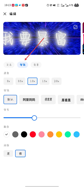 4、點擊字體選項,可設(shè)置速度、字體、字號、顏色和動效等。