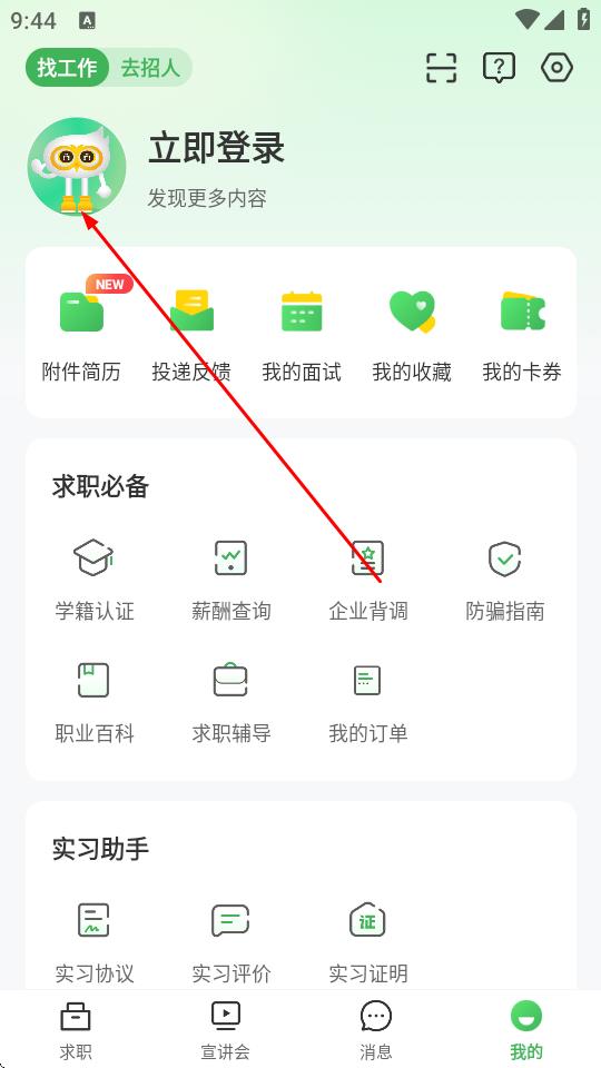 2、在我的頁面,點擊頭像位置的立即登錄選項。
