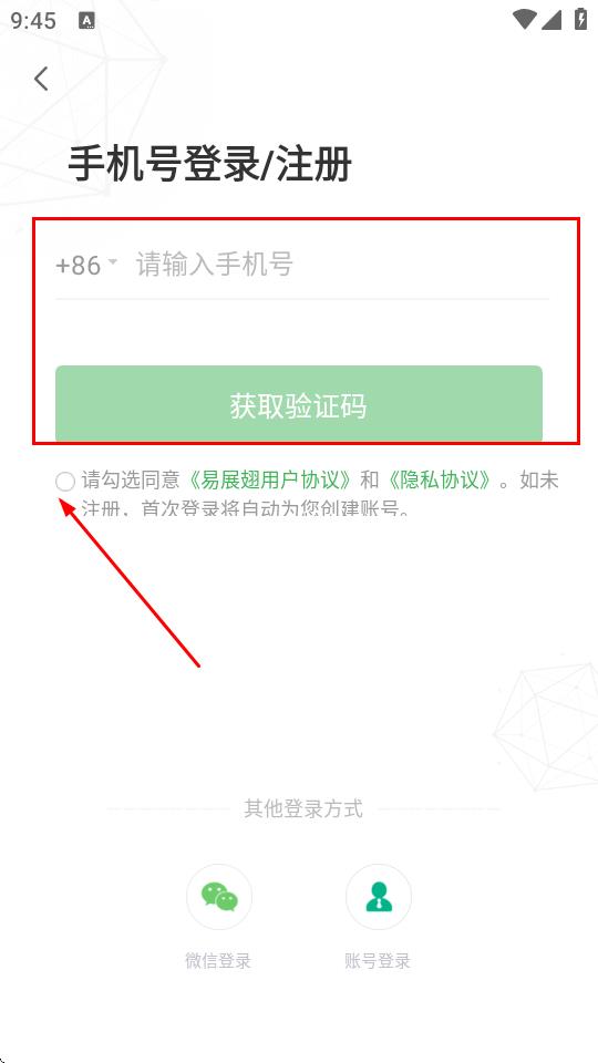 4、輸入手機號,勾選同意易展翅用戶協(xié)議和隱私協(xié)議,點擊獲取驗證碼。
