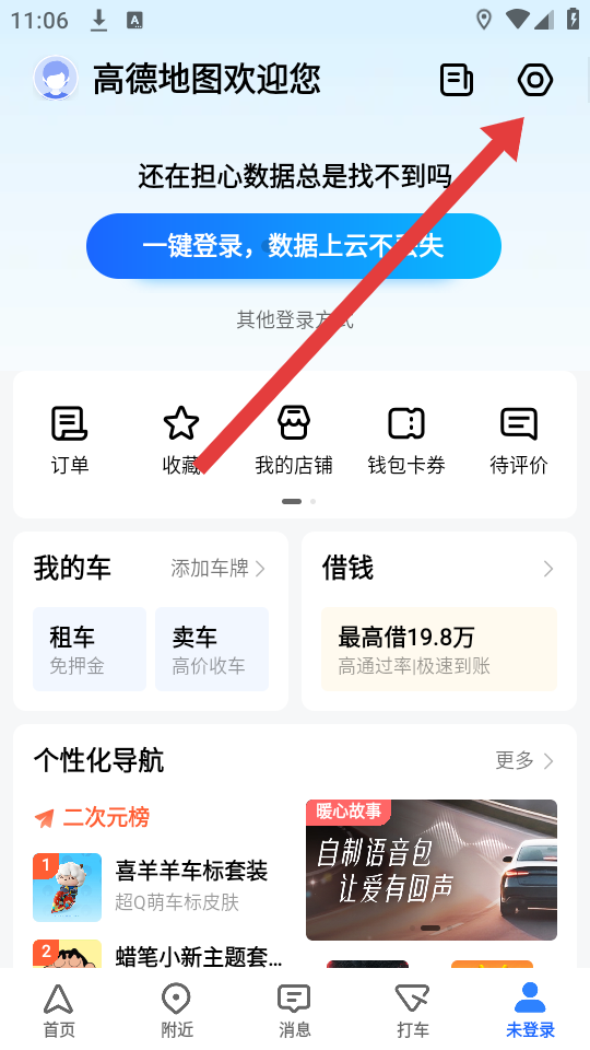 1、打開(kāi)高德地圖APP,進(jìn)入底部我的頁(yè)面,點(diǎn)擊右上角設(shè)置圖標(biāo),進(jìn)入設(shè)置界面,開(kāi)啟聲音提示關(guān)閉的操作流程。