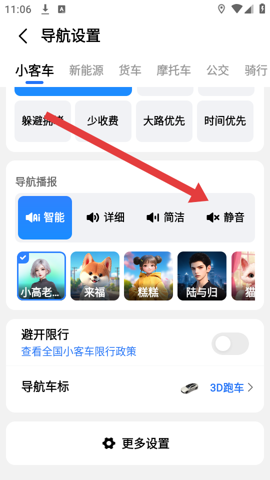 3、在導(dǎo)航設(shè)置頁(yè)面的導(dǎo)航播報(bào)板塊,選擇靜音的模式,即可關(guān)閉高德導(dǎo)航的聲音提示,讓導(dǎo)航過(guò)程安靜無(wú)擾。