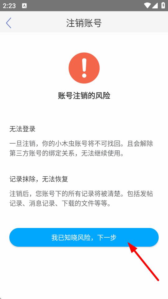 3、在注銷賬號頁面,閱讀賬號注銷的風(fēng)險提示后,點擊我已知曉風(fēng)險,下一步。