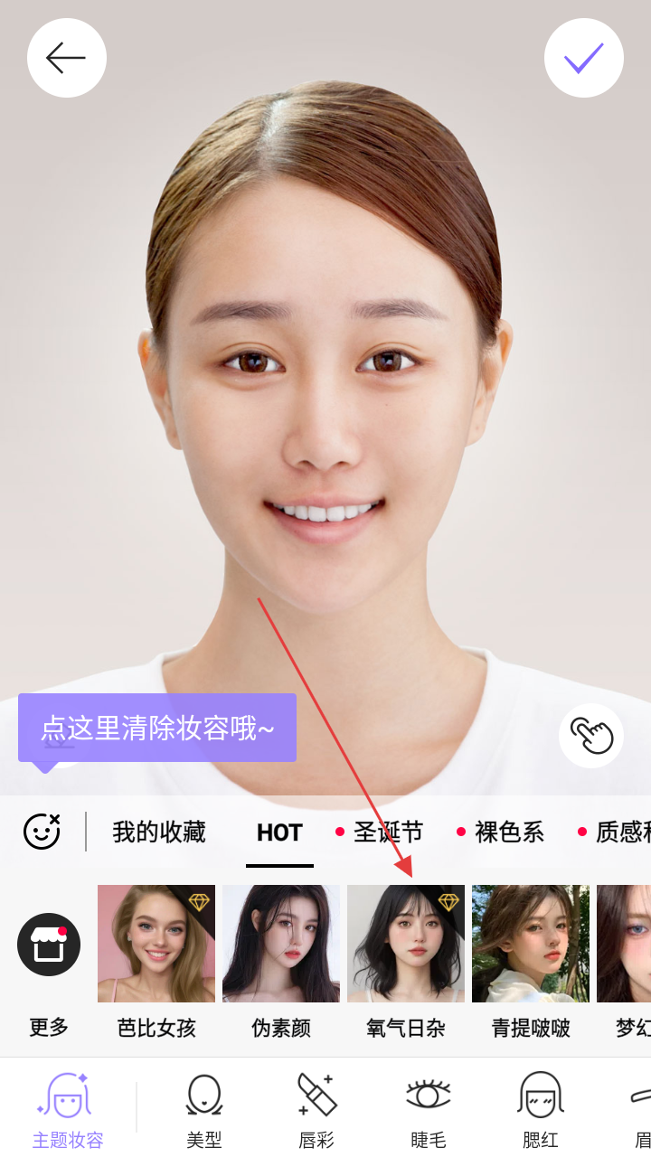 3、照片導入后,在下方的主題妝容等分類里,選擇喜歡的妝容效果應用到照片,完成圖片美化。