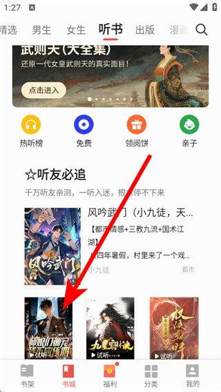 2、在聽書界面,點(diǎn)擊想要收聽的聽書作品封面,進(jìn)入作品詳情頁面。