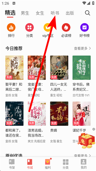 1、在掌閱書城頁面,點(diǎn)擊聽書選項(xiàng),進(jìn)入聽書界面。