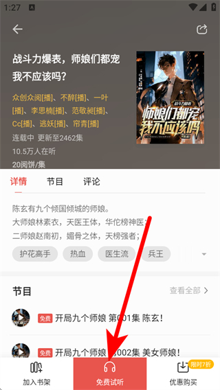 3、在作品詳情頁面,點(diǎn)擊免費(fèi)試聽按鈕,進(jìn)入聽書播放界面。