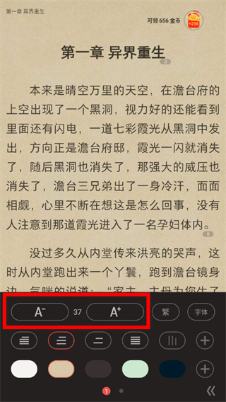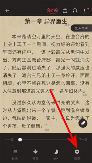 3、在小說閱讀頁,點(diǎn)擊右下角設(shè)置選項(xiàng),彈出設(shè)置菜單。