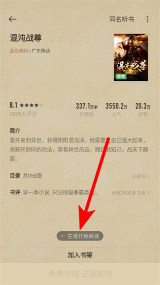 2、在小說詳情頁,左滑開始閱讀,進(jìn)入小說閱讀頁。