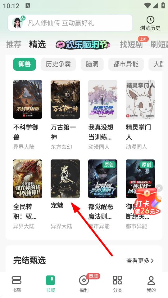 1、打開書旗小說App,進入書城界面,在眾多分類和推薦中,找到心儀小說如寵魅,點擊小說封面進入閱讀頁面。