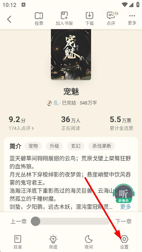 2、進入寵魅閱讀頁面后,點擊屏幕右下角設置按鈕,即可進入閱讀設置相關操作界面,為個性化閱讀做準備。