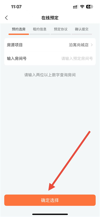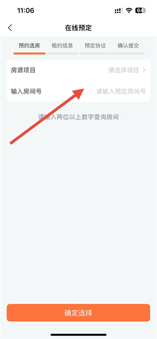 3、在在線預(yù)定頁面選擇房源項目,輸入房間號。