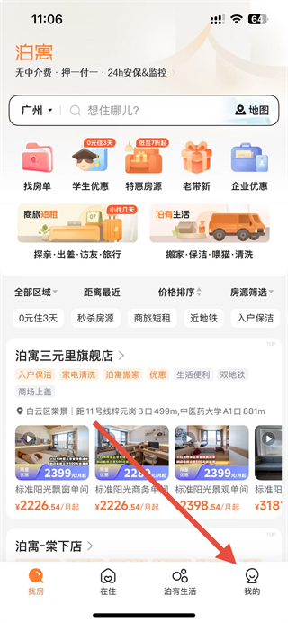 1、打開泊寓app,點(diǎn)擊底部導(dǎo)航欄最右側(cè)的我的。