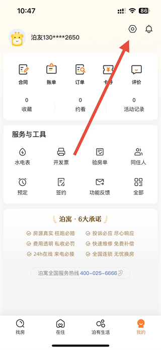 1、打開泊寓APP,在我的頁面點(diǎn)擊右上角設(shè)置圖標(biāo)。