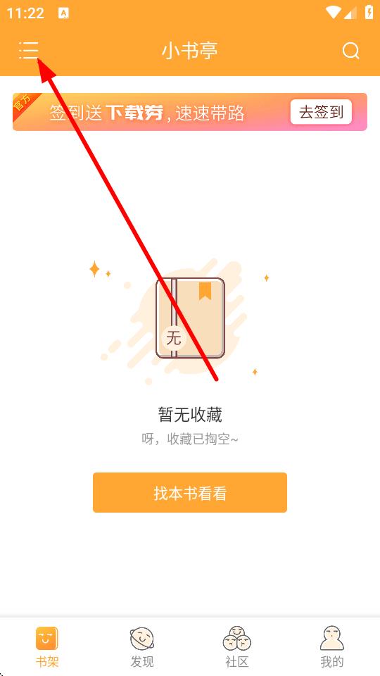 1、打開小書亭應用,在書架界面點擊左上角三條橫線圖標,打開側邊欄菜單。